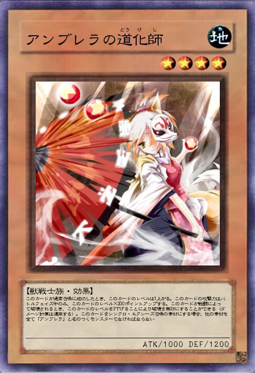 「オリジナルカテゴリ「アンブレラ」の3枚目です。状況によりレベル変動する半人半狐の道化役者です。魔術師の効果使用後であれば生存確率は高くなるでしょう。効果長くなっちゃったんでミスが無いか心配ですw。」(2014-01-18 00:05)