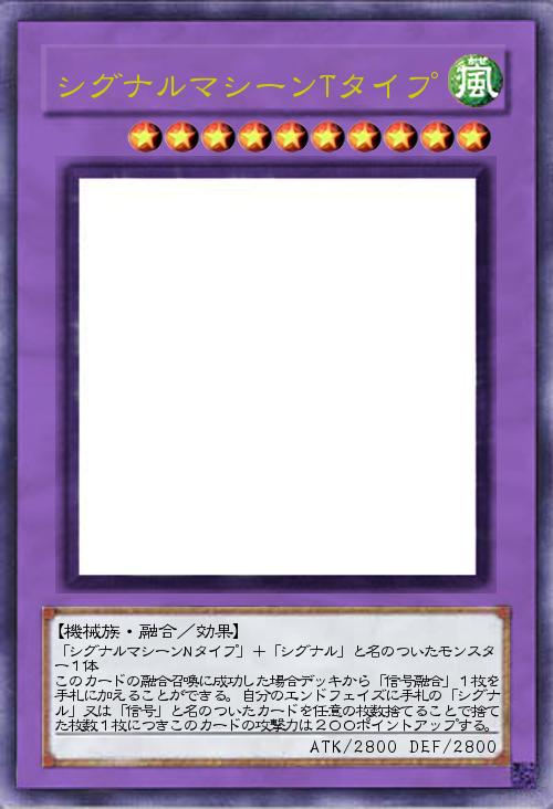 「シグナルマシーンNタイプ」+「シグナル」と名のついたモンスター1体 このカードの融合召喚に成功した場合デッキから「信号融合」1枚を手札に加えることができる。自分のエンドフェイズに手札の「シグナル」又は「信号」と名のついたカードを任意の枚数捨てることで捨てた枚数1枚につきこのカードの攻撃力は200ポイントアップする。 |