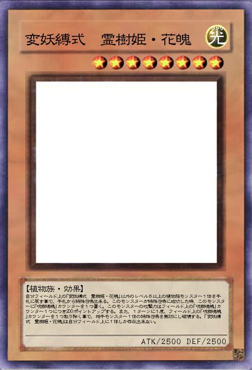 | 自分フィールド上の「変妖縛式 霊樹姫・花魄」以外のレベル5以上の植物族モンスター1体を手札に戻す事で、手札から特殊召喚出来る。このモンスターが特殊召喚に成功した時、このモンスターに「呪樹魂魄」カウンターを1つ置く。このモンスターの攻撃力はフィールド上の「呪樹魂魄」カウンター1つにつき200ポイントアップする。また、1ターンに1度、フィールド上の「呪樹魂魄」カウンターを1つ取り除く事で、相手モンスター1体の特殊召喚を無効にし破壊する。「変妖縛式 霊樹姫・花魄」は自分フィールド上に1体しか存在出来ない。 | |||
