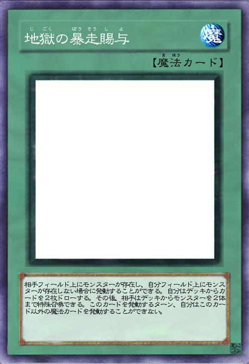 | 相手フィールド上にモンスターが存在し、自分フィールド上にモンスターが存在しない場合に発動することができる。自分はデッキからカードを2枚ドローする。その後、相手はデッキからモンスターを2体まで特殊召喚できる。このカードを発動するターン、自分はこのカード以外の魔法カードを発動することができない。 | |||