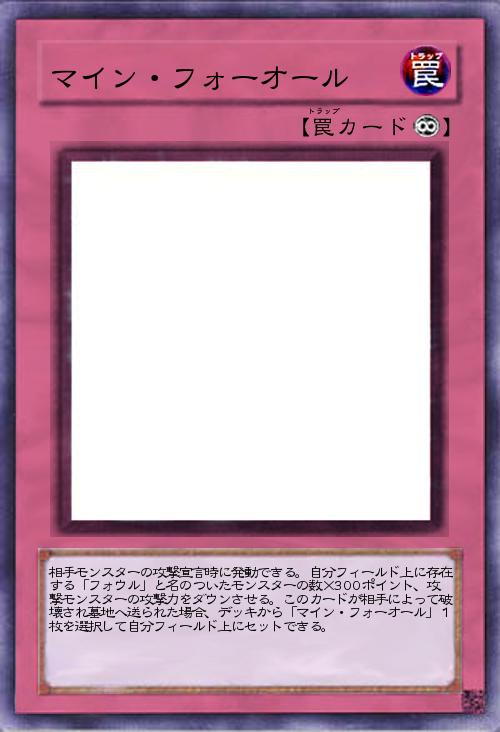 | 相手モンスターの攻撃宣言時に発動できる。自分フィールド上に存在する「フォウル」と名のついたモンスターの数×300ポイント、攻撃モンスターの攻撃力をダウンさせる。このカードが相手によって破壊され墓地へ送られた場合、デッキから「マイン・フォーオール」1枚を選択して自分フィールド上にセットできる。 | |||