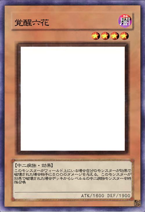 | このモンスターがフィールド上にいる場合自分のモンスターが効果で破壊された場合相手に500のダメージを与える、このモンスターが効果で破壊された場合デッキからレベル4の中二病族モンスターを特殊召喚 | |||