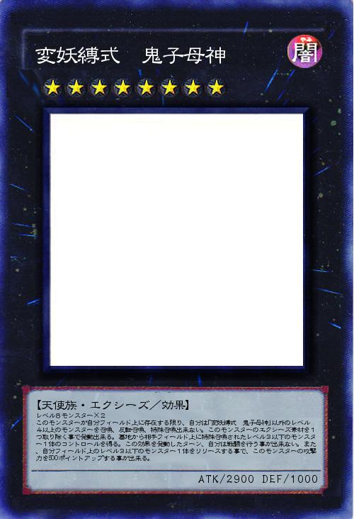 レベル8モンスター×2 このモンスターが自分フィールド上に存在する限り、自分は「変妖縛式 鬼子母神」以外のレベル4以上のモンスターを召喚、反転召喚、特殊召喚出来ない。このモンスターのエクシーズ素材を1つ取り除く事で発動出来る。墓地から相手フィールド上に特殊召喚されたレベル3以下のモンスター1体のコントロールを得る。この効果を発動したターン、自分は戦闘を行う事が出来ない。また、自分フィールド上のレベル3以下のモンスター1体をリリースする事で、このモンスターの攻撃力を500ポイントアップする事が出来る。 |