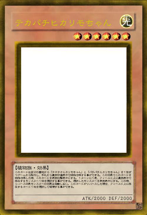 | このカードは自分の墓地から「テカテカヒカリモちゃん」と「パチパチヒカリモちゃん」を1体ずつゲームから除外し、手札から裏側守備表示で特殊召喚する事ができる。この効果でこのカードを特殊召喚した時、このカードを表側攻撃表示にする。1ターンに1度、フィールド上に裏側表示で存在するモンスター1体を選択する事ができる。選択したモンスターを表側表示にする。この時、リバース効果モンスターの効果は発動しない。このカードがリバースした場合、フィールド上に存在するカード1枚を選択して破壊する事ができる。 | |||