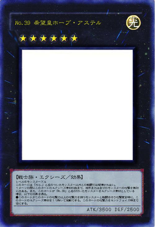 レベル6モンスター×4 このカードは「No.」と名のついたモンスター以外との戦闘では破壊されない。 1ターンの間にこのカードのエクシーズ素材の数まで、相手または自分のモンスターの攻撃を無効に出来る。また、このカードが「No.39」と名の付いたモンスターをエクシーズ素材としている場合、以下の効果を得る。 ●このカードがこのカードの攻撃力以上の攻撃力を持つモンスターと戦闘を行う攻撃宣言時に、このカードのエクシーズ素材を1つ除いて発動できる。このカードの攻撃力をエンドフェイズ時まで倍にする。 |