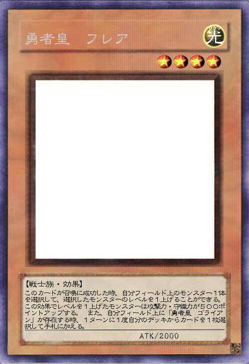 | このカードが召喚に成功した時、自分フィールド上のモンスター1体を選択して、選択したモンスターのレベルを1上げることができる。この効果でレベルを1上げたモンスターは攻撃力・守備力が500ポイントアップする。 また、自分フィールド上に「勇者皇 ゴライアン」が存在する時、1ターンに1度自分のデッキからカードを1枚選択して手札に加える。 | |||