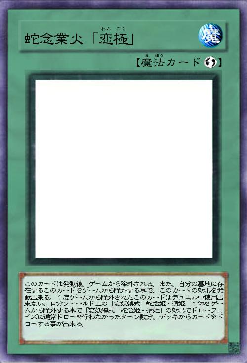 | このカードは発動後、ゲームから除外される。また、自分の墓地に存在するこのカードをゲームから除外する事で、このカードの効果を発動出来る。1度ゲームから除外されたこのカードはデュエル中使用出来ない。自分フィールド上の「変妖縛式 蛇念姫・清姫」1体をゲームから除外する事で「変妖縛式 蛇念姫・清姫」の効果でドローフェイズに通常ドローを行わなかったターン数分、デッキからカードをドローする事が出来る。 | |||