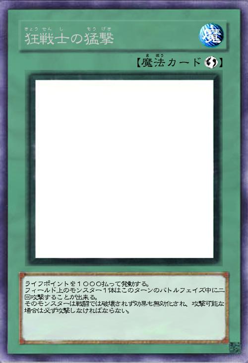 ライフポイントを1000払って発動する。 フィールド上のモンスター1体はこのターンのバトルフェイズ中に二回攻撃することが出来る。 そのモンスターは戦闘では破壊されず効果も無効化され、攻撃可能な場合は必ず攻撃しなければならない。 |
