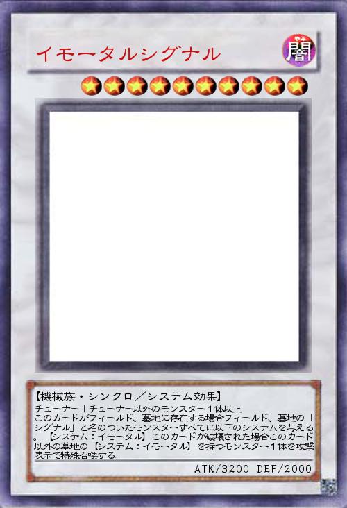 | チューナー+チューナー以外のモンスター1体以上 このカードがフィールド、墓地に存在する場合フィールド、墓地の「シグナル」と名のついたモンスターすべてに以下のシステムを与える。【システム:イモータル】このカードが破壊された場合このカード以外の墓地の【システム:イモータル】を持つモンスター1体を攻撃表示で特殊召喚する。 | |||