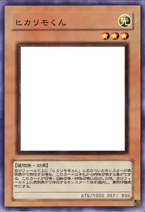 | 自分フィールド上に「ヒカリモちゃん」と名のついたモンスターが表側表示で存在する場合、このカードは手札から特殊召喚する事ができる。このカードが召喚・反転召喚・特殊召喚に成功した時、自分フィールド上に表側表示で存在するモンスター1体を選択し、裏側守備表示にする。 | |||