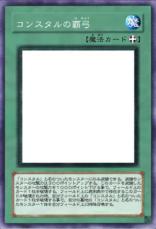 | 「コンスタル」と名のついたモンスターにのみ装備できる。装備モンスターの攻撃力は300ポイントアップする。このカードを装備したモンスターの攻撃力を1000ポイント下げる事で、フィールド上のカード1枚を破壊する。フィールド上に表側表示で存在するこのカードが破壊された時、自分フィールド上の「コンスタル」と名のついたカード1枚を破壊する事で、自分の墓地の「コンスタル」と名のついたモンスター1体を自分フィールド上に特殊召喚する。 | |||