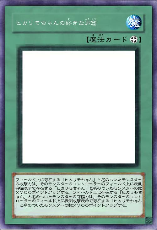 | フィールド上に存在する「ヒカリモちゃん」と名のついたモンスターの攻撃力は、そのモンスターのコントローラーのフィールド上に表側守備表示で存在する「ヒカリモちゃん」と名のついたモンスターの数×700ポイントアップする。フィールド上に存在する「ヒカリモちゃん」と名のついたモンスターの守備力は、そのモンスターのコントローラーのフィールド上に表側攻撃表示で存在する「ヒカリモちゃん」と名のついたモンスターの数×700ポイントアップする。 | |||