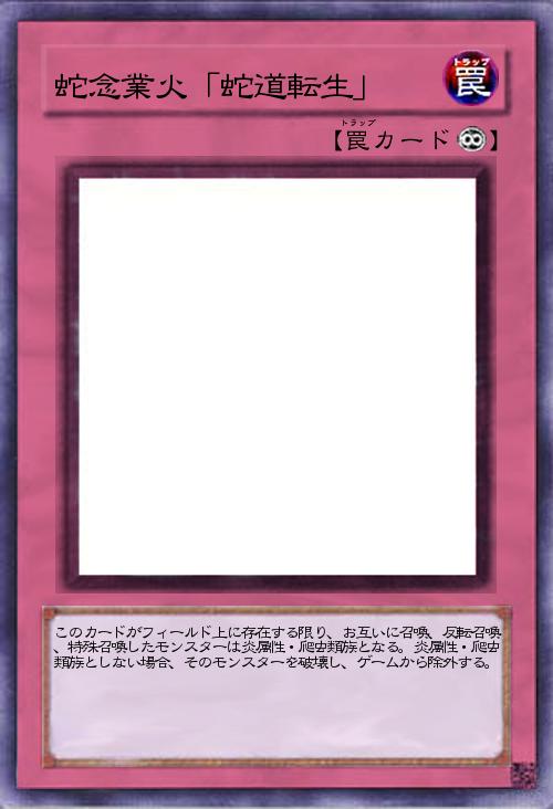 このカードがフィールド上に存在する限り、お互いに召喚、反転召喚、特殊召喚したモンスターは炎属性・爬虫類族となる。炎属性・爬虫類族としない場合、そのモンスターを破壊し、ゲームから除外する。 |