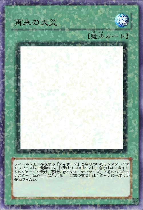 | フィールド上に存在する「ディザーズ」と名のついたモンスター1体をリリースして発動する。相手は1000ポイント、自分は400ポイントのダメージを受け、墓地に存在する「ディザーズ」と名のついたモンスター1体を手札に加える。「再来の天災」は1ターンに一度しか発動できない。 | |||