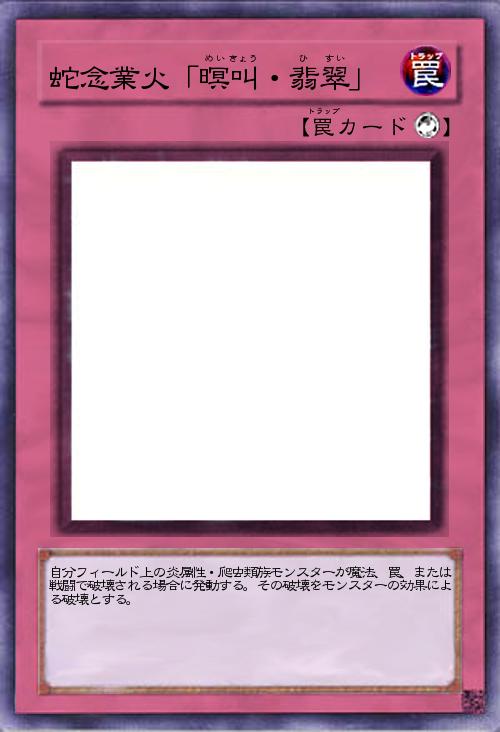 自分フィールド上の炎属性・爬虫類族モンスターが魔法、罠、または戦闘で破壊される場合に発動する。その破壊をモンスターの効果による破壊とする。 |
