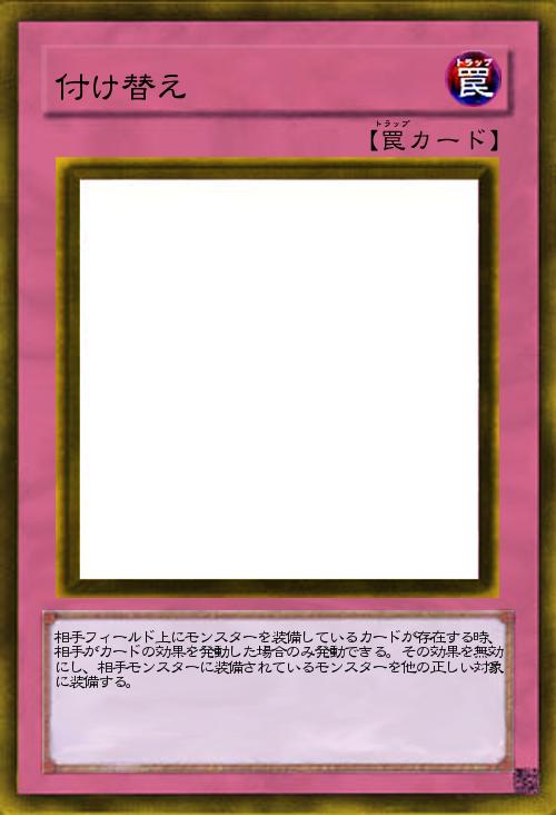 | 相手フィールド上にモンスターを装備しているカードが存在する時、相手がカードの効果を発動した場合のみ発動できる。その効果を無効にし、相手モンスターに装備されているモンスターを他の正しい対象に装備する。 | |||