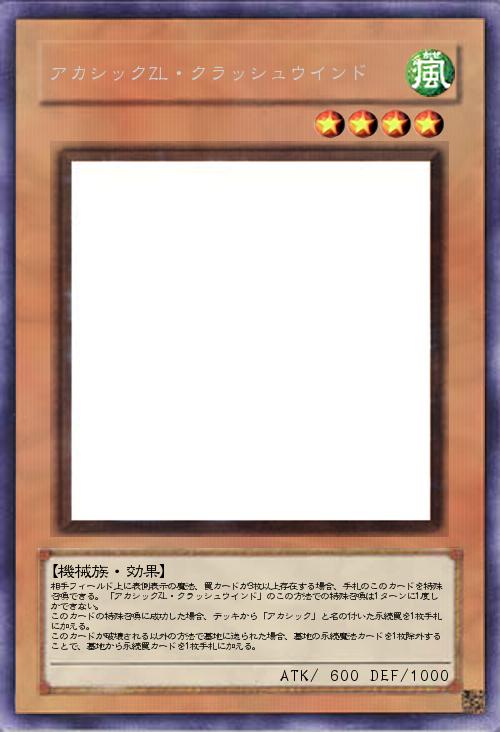 相手フィールド上に表側表示の魔法、罠カードが3枚以上存在する場合、手札のこのカードを特殊召喚できる。「アカシックZL・クラッシュウインド」のこの方法での特殊召喚は1ターンに1度しかできない。 このカードの特殊召喚に成功した場合、デッキから「アカシック」と名の付いた永続罠を1枚手札に加える。 このカードが破壊される以外の方法で墓地に送られた場合、墓地の永続魔法カードを1枚除外することで、墓地から永続罠カードを1枚手札に加える。 |