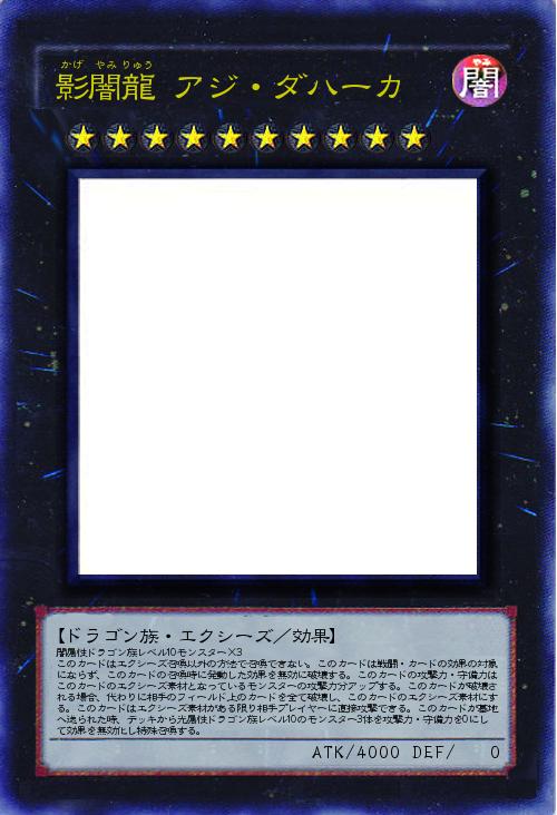 闇属性ドラゴン族レベル10モンスター×3 このカードはエクシーズ召喚以外の方法で召喚できない。このカードは戦闘・カードの効果の対象にならず、このカードの召喚時に発動した効果を無効に破壊する。このカードの攻撃力・守備力はこのカードのエクシーズ素材となっているモンスターの攻撃力分アップする。このカードが破壊される場合、代わりに相手のフィールド上のカードを全て破壊し、このカードのエクシーズ素材にする。このカードはエクシーズ素材がある限り相手プレイヤーに直接攻撃できる。このカードが墓地へ送られた時、デッキから光属性ドラゴン族レベル10のモンスター3体を攻撃力・守備力を0にして効果を無効化し特殊召喚する。 |