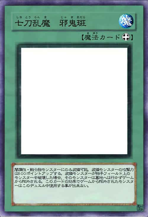 | 闇属性・戦士族モンスターにのみ装備可能。装備モンスターの攻撃力は500ポイントアップする。装備モンスターが相手フィールド上のモンスターを破壊した場合、そのモンスターは墓地へは行かずゲームから除外される。このカードの効果でゲームから除外されたモンスターはこのデュエル中使用する事が出来ない。 | |||