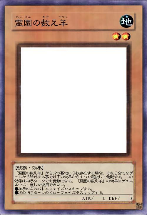「霊園の数え羊」が自分の墓地に3枚存在する場合、それら全てをゲームから除外する事で以下の効果から1つを選択して発動する。この効果は相手ターンでも発動できる。「霊園の数え羊」の効果はデュエル中に1度しか使用できない。 ●相手の次のバトルフェイズをスキップする。 ●次の相手ターンのドローフェイズをスキップする。 |