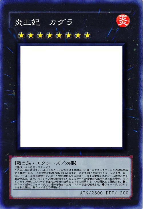 炎属性レベル8モンスター×2 このカードは自分フィールド上のカードが3枚以上破壊された時、エクストラデッキから特殊召喚する事が出来る。(この効果で特殊召喚出来る「炎王妃 カグラ」は1体まで)1ターンに1度、自分フィールド上の炎属性モンスター1体を選択してこのカードの下に重ねてエクシーズ素材とする事が出来る。また、エクシーズ素材を持っているこのカードが破壊され墓地へ送られた場合、エンドフェイズ時にこのカードを墓地から特殊召喚して以下の効果から1つを選択して発動する。●このカードを除くフィールド上の特殊召喚されたモンスターを全て破壊する。●フィールド上のセットされた魔法、罠カードを全て破壊する。 |
