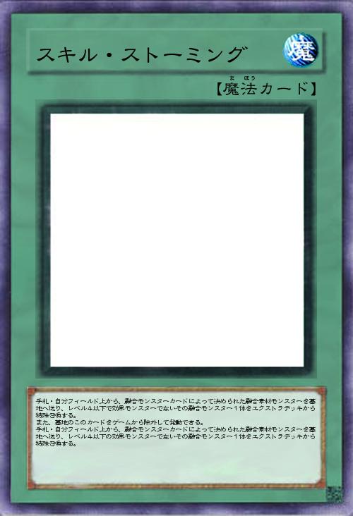 手札・自分フィールド上から、融合モンスターカードによって決められた融合素材モンスターを墓地へ送り、レベル4以下で効果モンスターでないその融合モンスター1体をエクストラデッキから特殊召喚する。 また、墓地のこのカードをゲームから除外して発動できる。 手札・自分フィールド上から、融合モンスターカードによって決められた融合素材モンスターを墓地へ送り、レベル4以下の効果モンスターでないその融合モンスター1体をエクストラデッキから特殊召喚する。 |