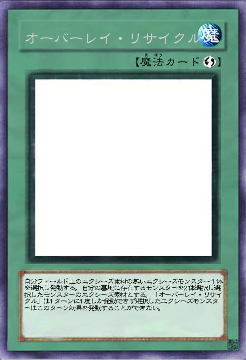 | 自分フィールド上のエクシーズ素材の無いエクシーズモンスター1体を選択し発動する。自分の墓地に存在するモンスターを2体選択し選択したモンスターのエクシーズ素材とする。「オーバーレイ・リサイクル」は1ターンに1度しか発動できず選択したエクシーズモンスターはこのターン効果を発動することができない。 | |||