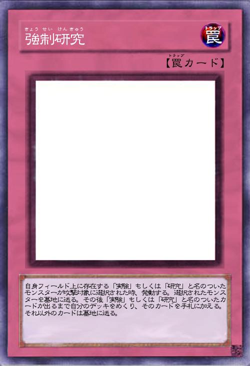 | 自身フィールド上に存在する「実験」もしくは「研究」と名のついたモンスターが攻撃対象に選択された時、発動する。選択されたモンスターを墓地に送る。その後「実験」もしくは「研究」と名のついたカードが出るまで自分のデッキをめくり、そのカードを手札に加える。それ以外のカードは墓地に送る。 | |||