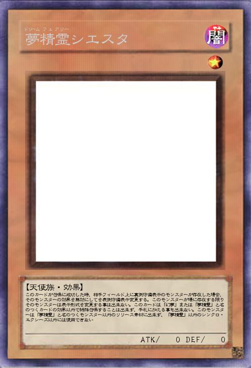 | このカードが召喚に成功した時、相手フィールド上に裏側守備表示のモンスターが存在した場合、そのモンスターの効果を無効にしてを表側守備表示変更する。このモンスターが場に存在する限りそのモンスターは表示形式を変更する事は出来ない。このカードは「幻夢」または「夢精霊」と名のつくカードの効果以外で特殊召喚することは出来ず、手札に加える事も出来ない。このモンスターは「夢精霊」と名のつくモンスター以外のリリース素材に出来ず、「夢精霊」以外のシンクロ・エクシーズ以外には使用できない | |||