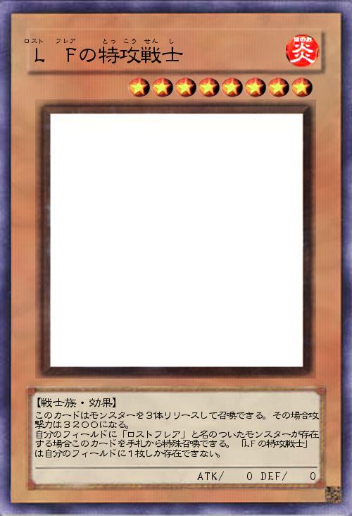 このカードはモンスターを3体リリースして召喚できる。その場合攻撃力は3200になる。 自分のフィールドに「ロストフレア」と名のついたモンスターが存在する場合このカードを手札から特殊召喚できる。「LFの特攻戦士」は自分のフィールドに1枚しか存在できない。 |