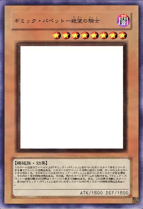 | このカードは自分フィールド上の「ギミック・パペット」と名のついたモンスター1体をリリースする事でアドバンス召喚出来る。このカードがアドバンス召喚に成功した時、デッキの上からカードを3枚めくる。その中にレベル8の「ギミック・パペット」と名のついたモンスターがある場合、その内の1体を特殊召喚出来る。その後、残りのカードをゲームから除外する。「ギミック・パペットー絶望の騎士」の効果は1ターンに1度まで発動出来る。また、この効果を発動したターン、自分は「ギミック・パペット」と名のついたモンスター以外のモンスターの特殊召喚は出来ない。 | |||