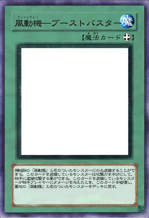 | 機械族の「風動像」と名のついたモンスターにのみ装備することができる。このカードを装備しているモンスターは攻撃力を半分にして、相手に直接攻撃する事ができる。このカードを装備しているモンスターが相手プレイヤーにダメージを与えたとき、このカードを破壊し、墓地の「風動像」と名のついたモンスターをデッキに戻す。 | |||