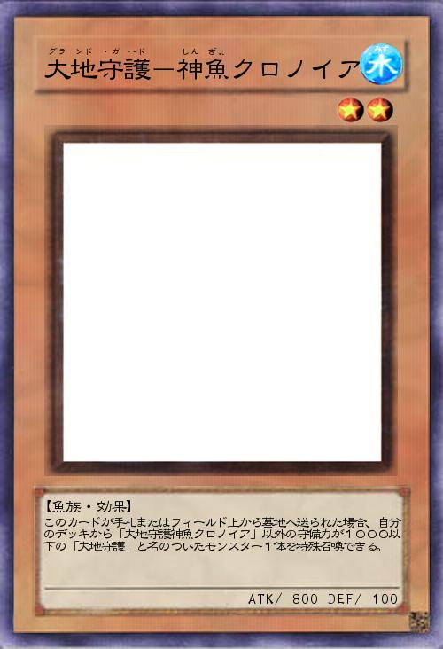 | このカードが手札またはフィールド上から墓地へ送られた場合、自分のデッキから「大地守護神魚クロノイア」以外の守備力が1000以下の「大地守護」と名のついたモンスター1体を特殊召喚できる。 | |||