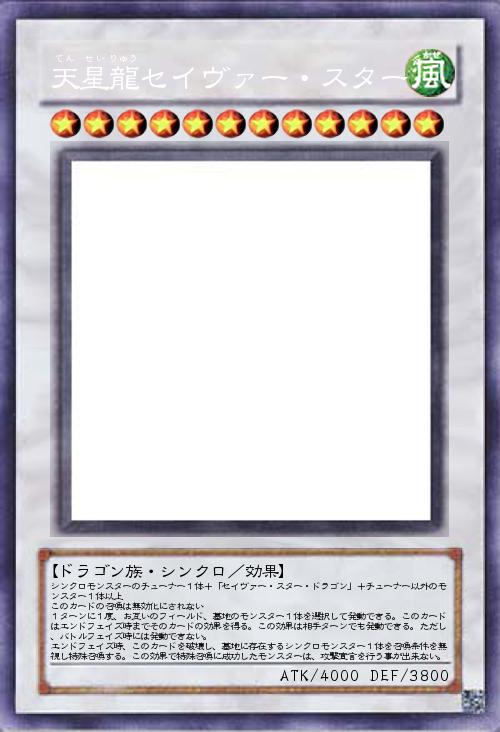 シンクロモンスターのチューナー1体+「セイヴァー・スター・ドラゴン」+チューナー以外のモンスター1体以上 このカードの召喚は無効化にされない 1ターンに1度、お互いのフィールド、墓地のモンスター1体を選択して発動できる。このカードはエンドフェイズ時までそのカードの効果を得る。この効果は相手ターンでも発動できる。ただし、バトルフェイズ時には発動できない。 エンドフェイズ時、このカードを破壊し、墓地に存在するシンクロモンスター1体を召喚条件を無視し特殊召喚する。この効果で特殊召喚に成功したモンスターは、攻撃宣言を行う事が出来ない。 |