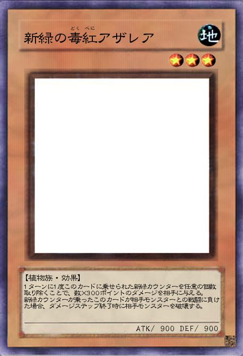 1ターンに1度このカードに乗せられた新緑カウンターを任意の個数取り除くことで、数×300ポイントのダメージを相手に与える。 新緑カウンターが乗ったこのカードが相手モンスターとの戦闘に負けた場合、ダメージステップ終了時に相手モンスターを破壊する。 |