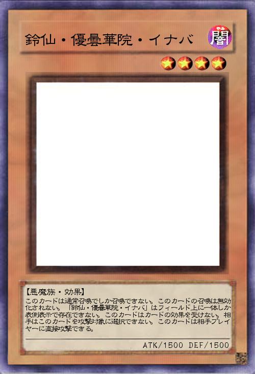 | このカードは通常召喚でしか召喚できない。このカードの召喚は無効化されない。「鈴仙・優曇華院・イナバ」はフィールド上に一体しか表側表示で存在できない。このカードはカードの効果を受けない。相手はこのカードを攻撃対象に選択できない。このカードは相手プレイヤーに直接攻撃できる。 | |||