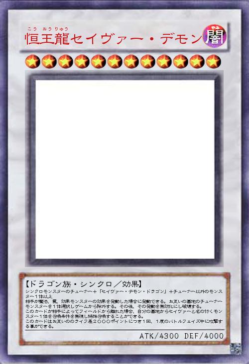 シンクロモンスターのチューナー+「セイヴァー・デモン・ドラゴン」+チューナー以外のモンスター1体以上 相手が魔法、罠、効果モンスターの効果を発動した場合に発動できる。お互いの墓地のチューナーモンスターを1体選択しゲームから除外する。その後、その発動を無効化にし破壊する。 このカードが相手によってフィールドから離れた場合、自分の墓地からセイヴァーと名の付くモンスター1体を召喚条件を無視し特殊召喚することができる。 このカードはお互いののライフ差2000ポイントにつき1回、1度のバトルフェイズ中に攻撃する事ができる。 |