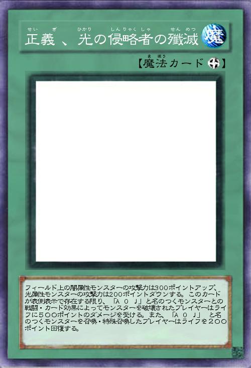 | フィールド上の闇属性モンスターの攻撃力は300ポイントアップ、光属性モンスターの攻撃力は200ポイントダウンする。このカードが表側表示で存在する限り、「A·O·J」と名のつくモンスターとの戦闘・カード効果によってモンスターを破壊されたプレイヤーはライフに500ポイントのダメージを受ける。また、「A·O·J」 と名のつくモンスターを召喚・特殊召喚したプレイヤーはライフを200ポイント回復する。 | |||