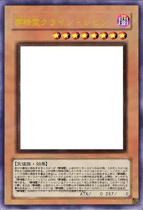 | 自分の墓地に存在するモンスターが「夢精霊」と名の付くモンスターのみの時、このモンスターは手札から特殊召喚できる。この効果で特殊召喚したこのモンスターはこのターン、シンクロ・エクシーズ召喚に使用する事はできない。このモンスターがフィールド上に存在するときに「夢精霊」と名の付くモンスターの効果でフィールド上のモンスターの表示形式が変更した場合、デッキから「夢精霊クライン・レビン」以外の「夢精霊」と名の付いたモンスターを効果を無効にして特殊召喚できる。「夢精霊クライン・レビン」はフィールド上に1枚しか存在できない。このカードは「幻夢」または「夢精霊」と名のつくカードの効果以外で特殊召喚することは出来ず、手札に加える事も出来ない。このモンスターは「夢精霊」と名のつくモンスター以外のリリース素材に出来ず、「夢精霊」以外のシンクロ・エクシーズ以外には使用できない | |||