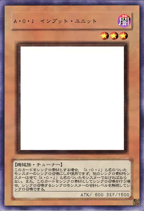 | このカードをシンクロ素材とする場合、「A・O・J」と名のついたモンスターのシンクロ召喚にしか使用できず、他のシンクロ素材モンスターは全て「A・O・J」と名のついたモンスターでなければならない。また、このカードをシンクロ素材としてシンクロ召喚を行う場合、シンクロ召喚するシンクロモンスターの合計レベルを無視してシンクロ召喚できる。 | |||