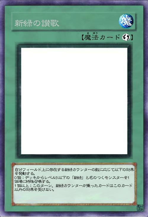 自分フィールド上に存在する新緑カウンターの数に応じて以下の効果を発動する。 0個:デッキからレベル3以下の「新緑」と名のつくモンスターを1体場に特殊召喚する。 1個以上:このターン、新緑カウンターが乗ったカードはこのカード以外の効果を受けない。 |