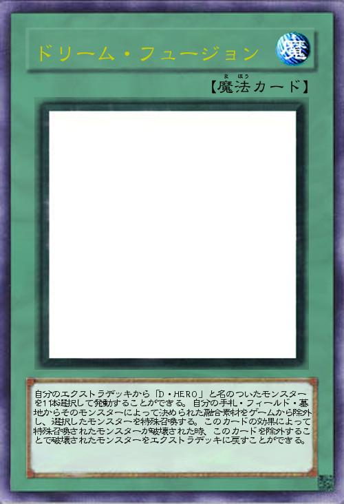 | 自分のエクストラデッキから「D・HERO」と名のついたモンスターを1体選択して発動することができる。自分の手札・フィールド・墓地からそのモンスターによって決められた融合素材をゲームから除外し、選択したモンスターを特殊召喚する。このカードの効果によって特殊召喚されたモンスターが破壊された時、このカードを除外することで破壊されたモンスターをエクストラデッキに戻すことができる。 | |||