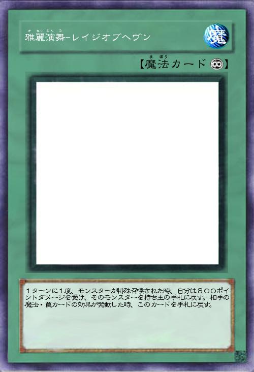 | 1ターンに1度、モンスターが特殊召喚された時、自分は800ポイントダメージを受け、そのモンスターを持ち主の手札に戻す。相手の魔法・罠カードの効果が発動した時、このカードを手札に戻す。 | |||