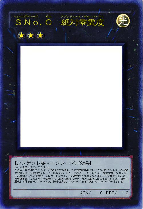 レベル3モンスター×4体以上 このカードが相手モンスターと戦闘を行う場合、その戦闘を無効にし、その相手モンスターの攻撃力分のダメージを相手プレイヤーに与える。また、このカードが「No.0 絶対霊度」をエクシーズ素材としている場合、このカードのエクシーズ素材を1つ取り除く事で、その相手モンスターを破壊する。このカードが破壊され、墓地へ送られた時、自分の墓地に存在する「No.0 絶対霊度」1体を自分フィールド上に特殊召喚し、このカードを下に重ねてエクシーズ素材とする。 |