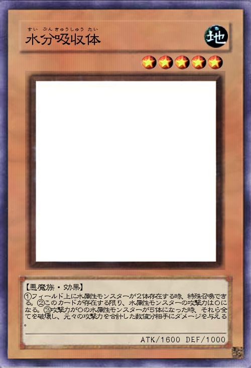 | ①フィールド上に水属性モンスターが2体存在する時、特殊召喚できる。②このカードが存在する限り、水属性モンスターの攻撃力は0になる。③攻撃力が0の水属性モンスターが5体になった時、それら全てを破壊し、元々の攻撃力を合計した数値分相手にダメージを与える。 | |||