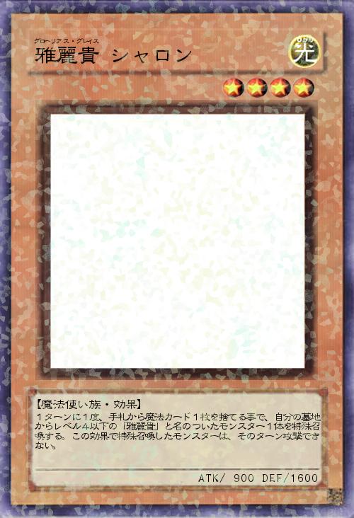 | 1ターンに1度、手札から魔法カード1枚を捨てる事で、自分の墓地からレベル4以下の「雅麗貴」と名のついたモンスター1体を特殊召喚する。この効果で特殊召喚したモンスターは、そのターン攻撃できない。 | |||