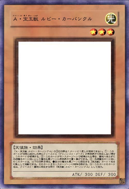 | 「A・宝玉獣 ルビー・カーバンクル」の③の効果は1ターンに1度しか使用できない。①:このカードが召喚に成功した時にフィールドに「アドバンスド・ダーク」が表側表示で存在しない場合、このカードを破壊する。②:このカードがモンスターゾーンで破壊された場合、墓地へ送らずに永続魔法カード扱いとして魔法&罠ゾーンに表側表示で置く事ができる。③:永続魔法カード扱いのこのカードは、以下の効果を得る。●自分の魔法&罠ゾーンに存在する「宝玉獣」カード1枚を対象として発動できる。そのカードをモンスターゾーンに特殊召喚する。④:このカードのカード名は、フィールド・墓地に存在する限り「宝玉獣 ルビー・カーバンクル」として扱う。 | |||