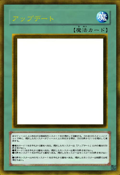 自分フィールド上に存在する機械族モンスター1体を選択して発動する。次の自分のスタンバイフェイズ時に、選択したモンスターがフィールド上に存在する場合、次の効果から1つを選択して適用する。 ●魔法カード1枚を手札から墓地へ送る。選択したモンスターは「アップデート」以外の魔法の効果を受けない。 ●罠カード1枚を手札から墓地へ送る。選択したモンスターは罠の効果を受けない。 ●効果モンスター1枚を手札から墓地へ送る。選択したモンスターはモンスターの効果を受けない。 ●効果モンスター以外のモンスター1枚を手札から墓地へ送る。選択したモンスターは戦闘では破壊されない。 |