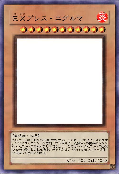 | このカードは手札から特殊召喚できる。このカードはリリースできず、シンクロ・エクシーズ素材とする場合は、炎属性・機械族のシンクロ・エクシーズの素材にしかできない。このカードがエクシーズ召喚のために素材とされた場合、デッキからレベル11のモンスター2体を選択して手札に加える。 | |||