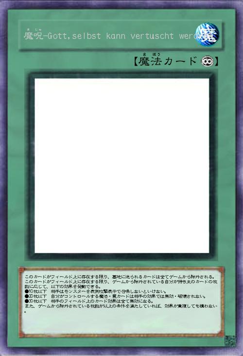 このカードがフィールド上に存在する限り、墓地に送られるカードは全てゲームから除外される。このカードがフィールド上に存在する限り、ゲームから除外されている自分が持ち主のカードの枚数に応じて、以下の効果を発動できる。 ●10枚以下 相手はモンスターを表側攻撃表示で召喚しないといけない。 ●20枚以下 自分がコントロールする魔法・罠カードは相手の効果では無効・破壊されない。 ●30枚以下 相手のフィールド上のカード効果は全て無効になる。 また、ゲームから除外されている枚数が以上の条件を満たしていれば、効果が重複しても構わない。 |